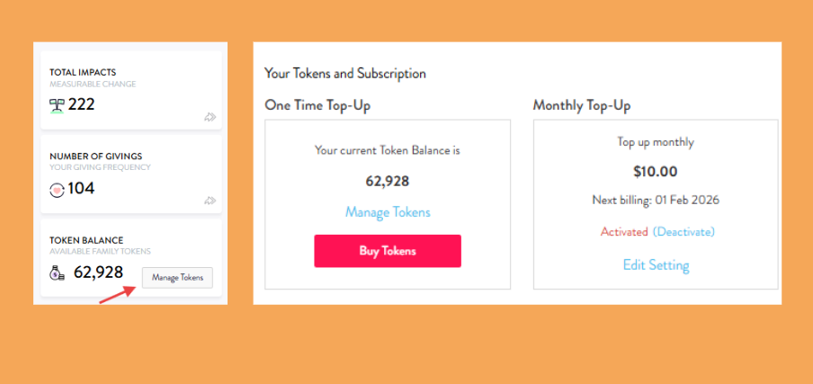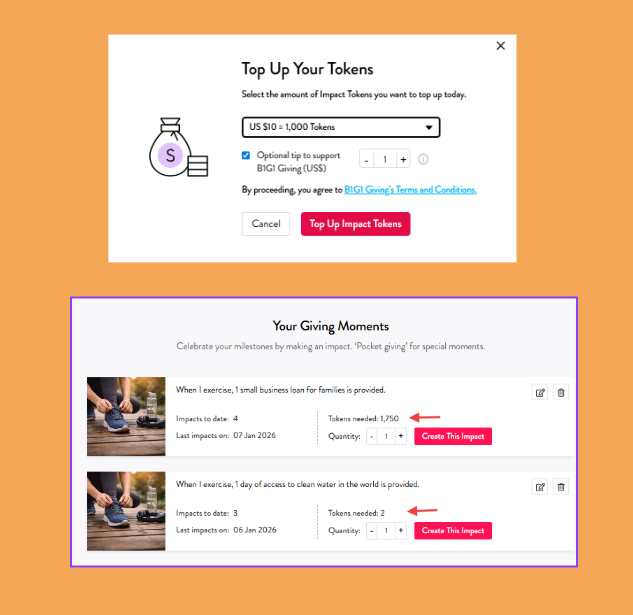 Impact Tokens are digital credits that represent your family’s giving power. Each Token (currently one Token is equivalent to US$0.01) equals a part or whole of an impact that creates a real-world difference — like planting a tree or giving a meal. For example, even a few Tokens which cost only a few cents can give access to life-saving resources in B1G1.