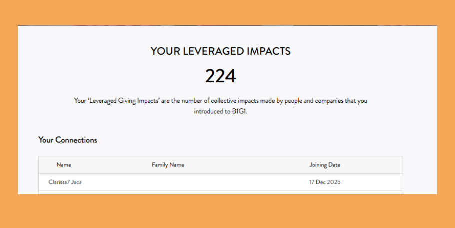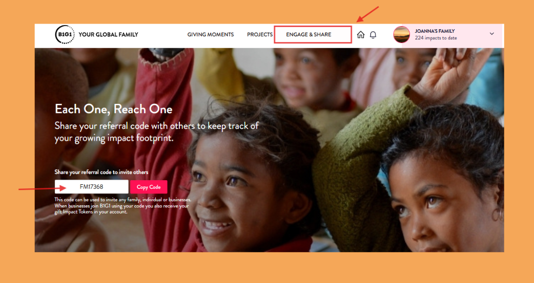 Now that’s so easy to do when you invite friends or relatives to join the B1G1 Family Program by sending your unique referral code (which is available on your ‘Engage & Share’ page).